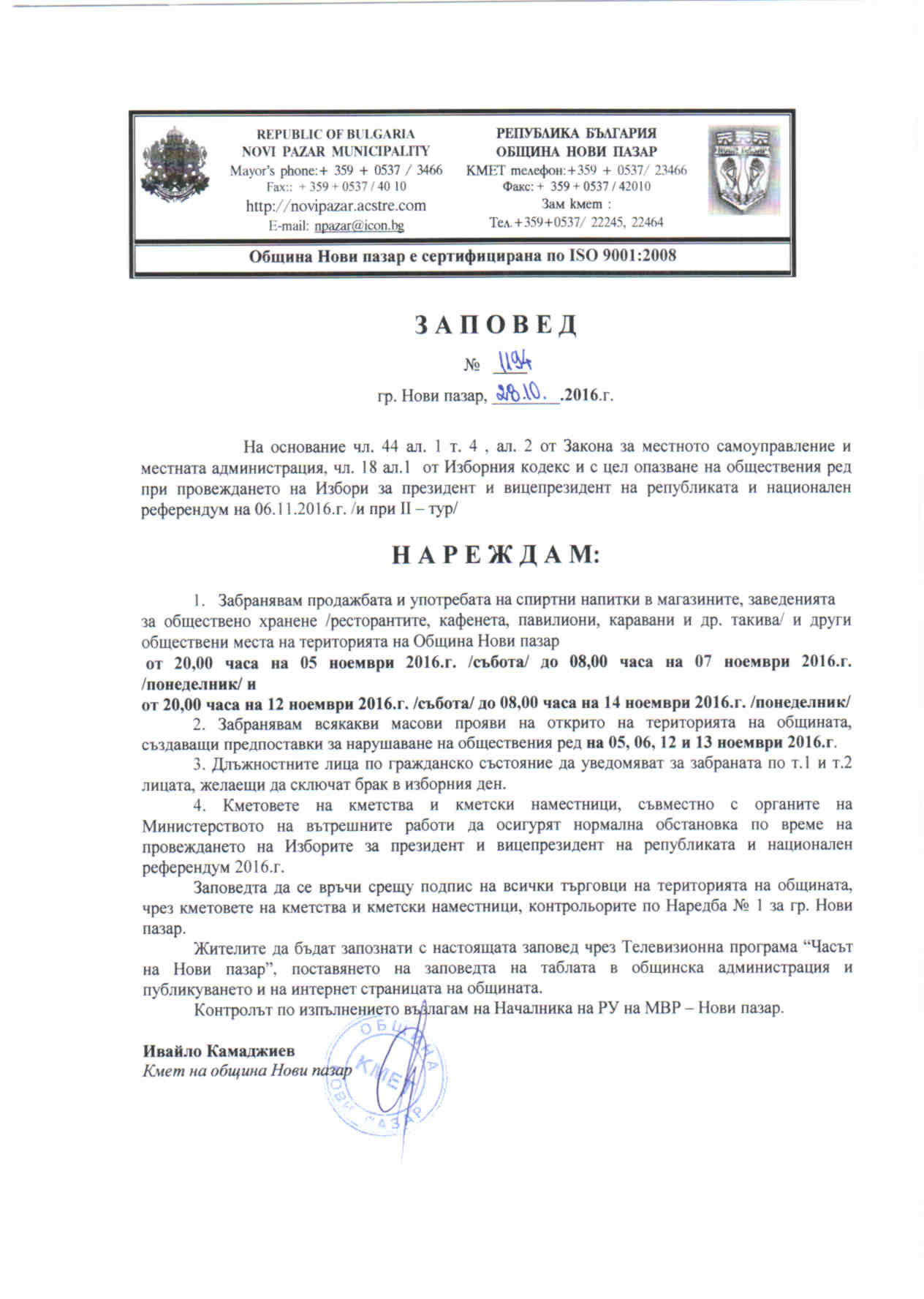 29.10.2016.г. - Заповед 1194 за опазване на обществения ред - забрана за продажба и употреба на алкохол